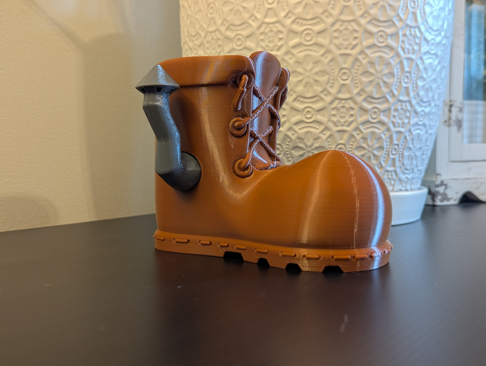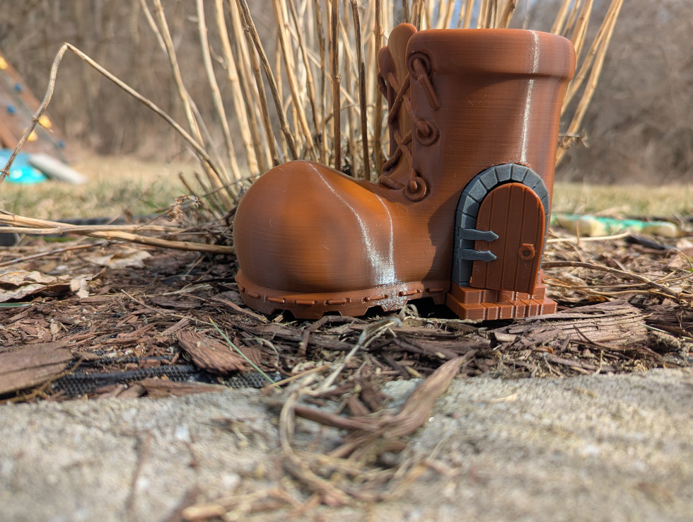 Our 3D printed homes are printed in PETG for use in outside gardens as it is water resistant and offer UV stability. The boot house roughly measures 6” x 4.5” x 4.5”.